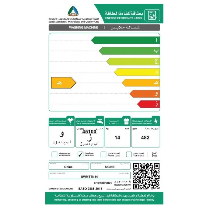 أوجين غسالة حوضين 14 كيلو – أبيض UWMTTN14