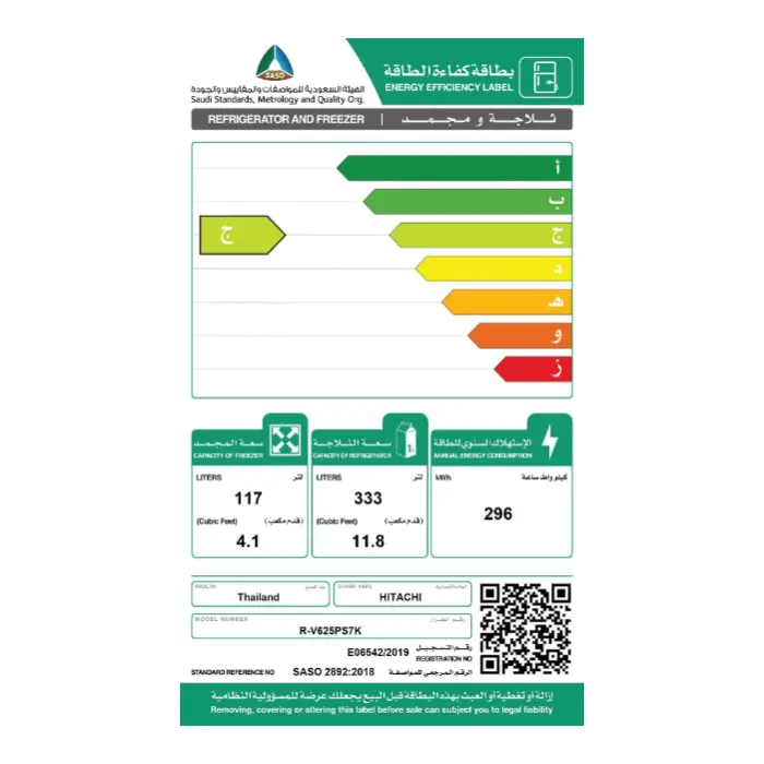 - معدل الإستهلاك السنوي للطاقة : 296 KW/H