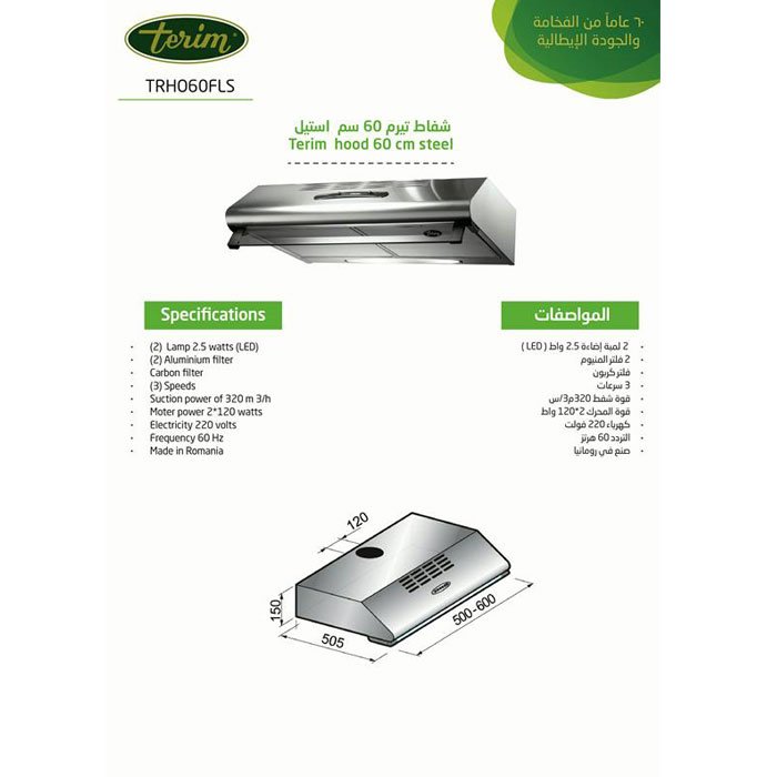 مواصفات تيرم شفاط المطبخ 60 سم أفقي – ستيل Trho60fls :