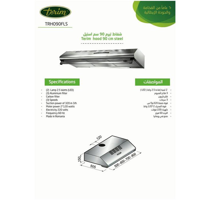 مواصفات تيرم شفاط هواء 90 سم أفقي – ستيل Trho90fls :