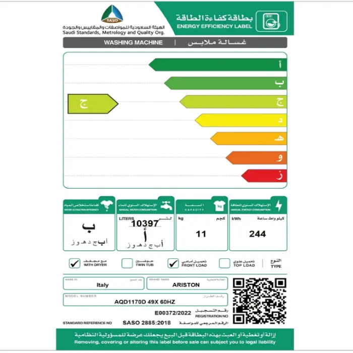 تتميز اريستون غسالة بـسعة 11 كيلو، مما يجعلها مثالية للعائلات الكبيرة أو للأشخاص الذين يحتاجون إلى غسيل كميات كبيرة من الملابس دفعة واحدة. توفر لك هذه السعة الكبيرة كفاءة عالية في التعامل مع الأحمال الثقيلة، مما يقلل من الحاجة إلى تكرار دورات الغسيل ويوفر الوقت والطاقة. سواء كانت الملابس اليومية أو البطانيات والأغطية، يمكنك الاعتماد على هذه الغسالة لتنظيف كميات كبيرة بفعالية وسرعة