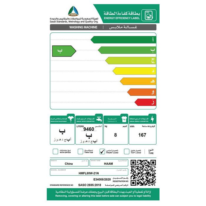 مواصفات هام غسالة اتوماتيك 8 كيلو – تعبئة امامية – أبيض Hmfl80w-21n :