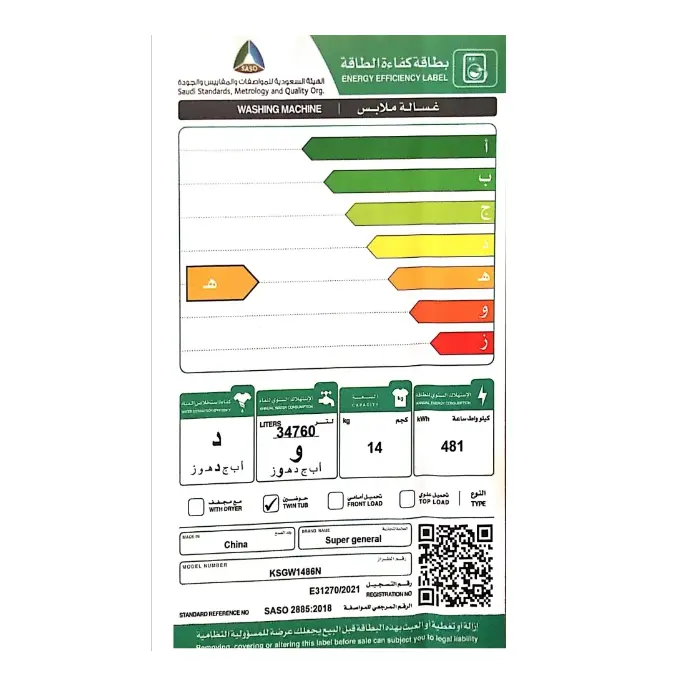 | الصنف | سوبر جنرال غسالة حوضين 14 كيلو – أبيض |