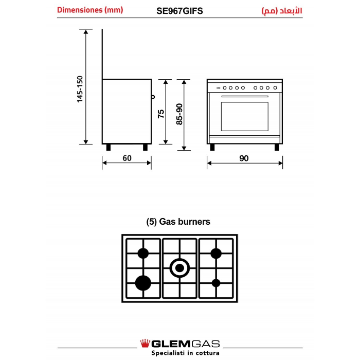 | الصنف | جليم غاز فرن – 5 شعلة 90 * 60 سم – إيطالي – ستيل |