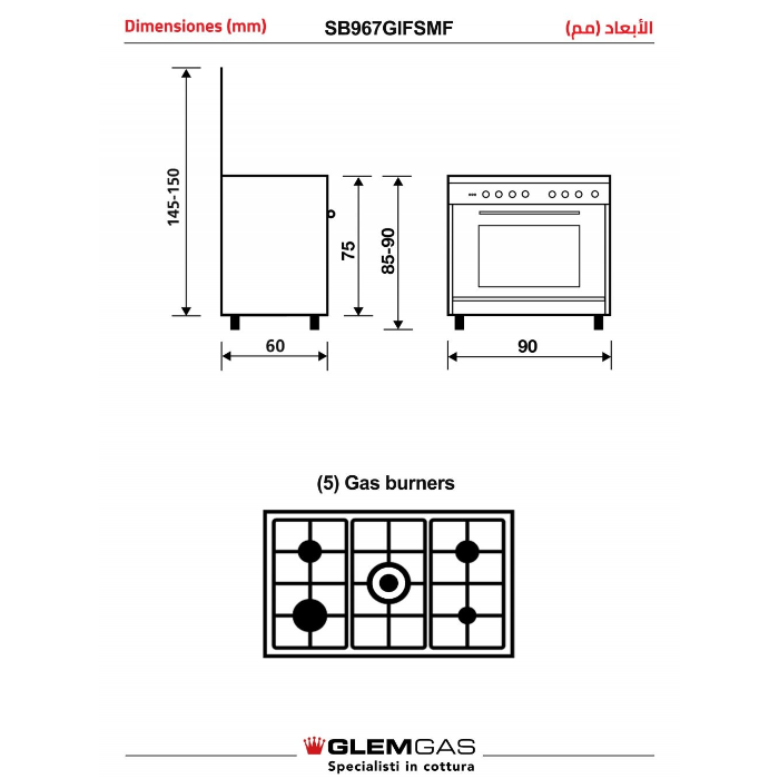 جليم غاز فرن - 5 شعلة 90 * 60 سم - إيطالي - ستيل Se967gifs