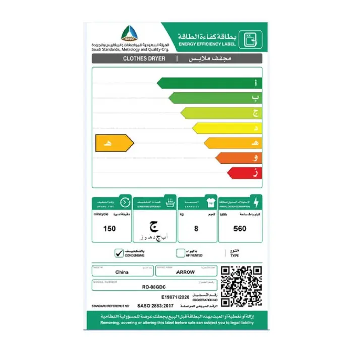 ارو مجفف ملابس 8 كيلو مع مكثف – أبيض RO-08GDC