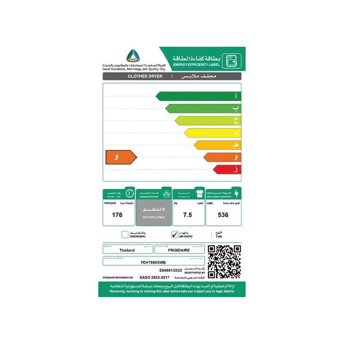 الوسوم: مجفف 7.5 كيلو, مجفف فريجدير, مجفف ملابس