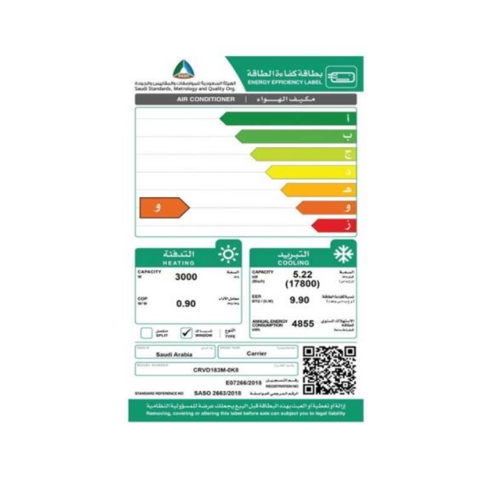 مواصفات كارير مكيف شباك 17800 وحدة عملاق – حار/بارد Crvd183m-ok8 :