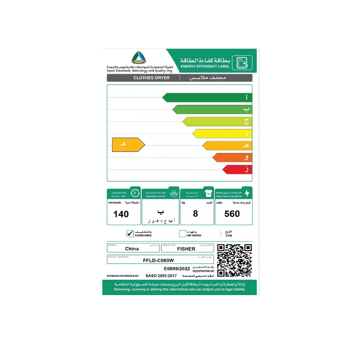 مواصفات فيشر نشاف ملابس 8 كيلو – مكثف – أبيض Ffld-c080w :
