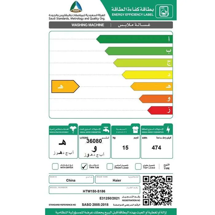هاير غسالة حوضين 15 كيلو – أبيض HTW150-S186